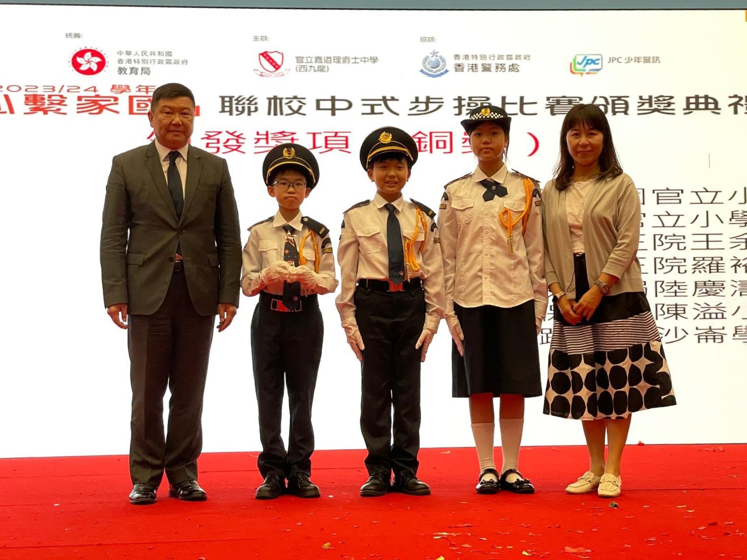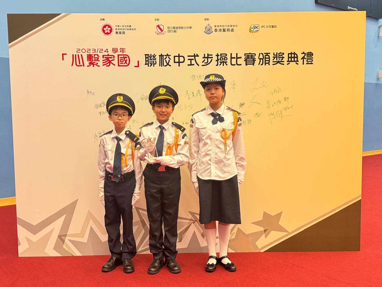 本校升旗隊三名隊員參加由教育局統籌、官立嘉道理爵士中學(西九龍)主辦、香港警務處及少年警訊協辦的「心繫家國」-聯校中式步操比賽 (小學組)。頒獎典禮於警官會所舉行,大會邀請了保安局局長鄧炳強先生,GBS,PDSM,JP及教育局常任秘書長李美嫦女士,JP作主禮嘉賓。參賽同學表現出色,首次參賽即勇奪銅獎。