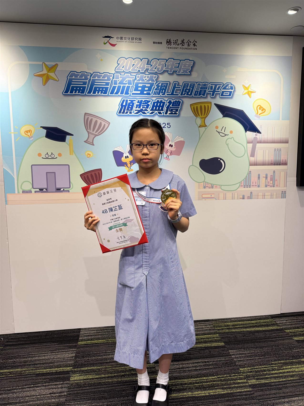 本校四至六年級學生參加由中國文化研究院舉辦的「篇篇流螢」網上閱讀計劃,4B班陳芷萾在本年計劃中成績優異,榮獲「個人卓越表現獎」金獎。