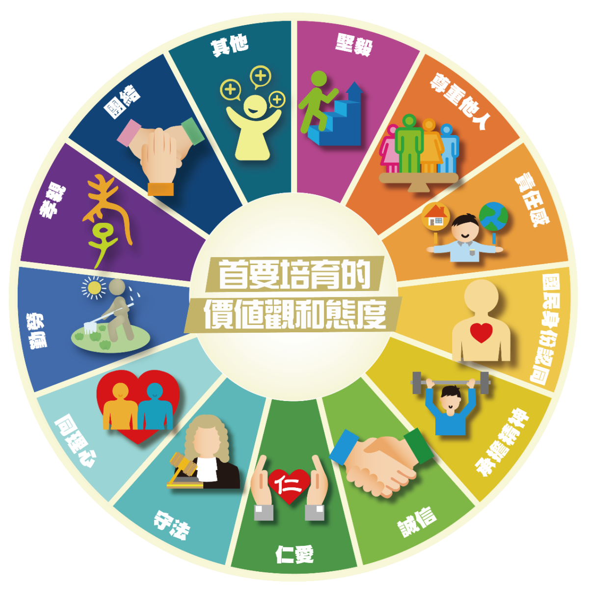 價值觀教育是全人教育不可或缺的一環。透過不同學習領域/學科的教學,以及多元化的學習經歷,培養學生正確的價值觀與積極的態度。